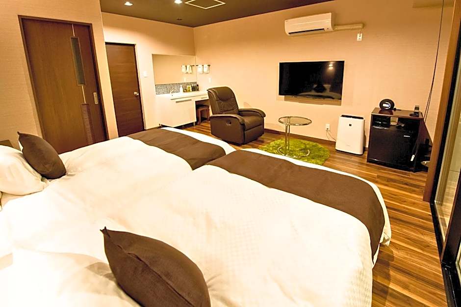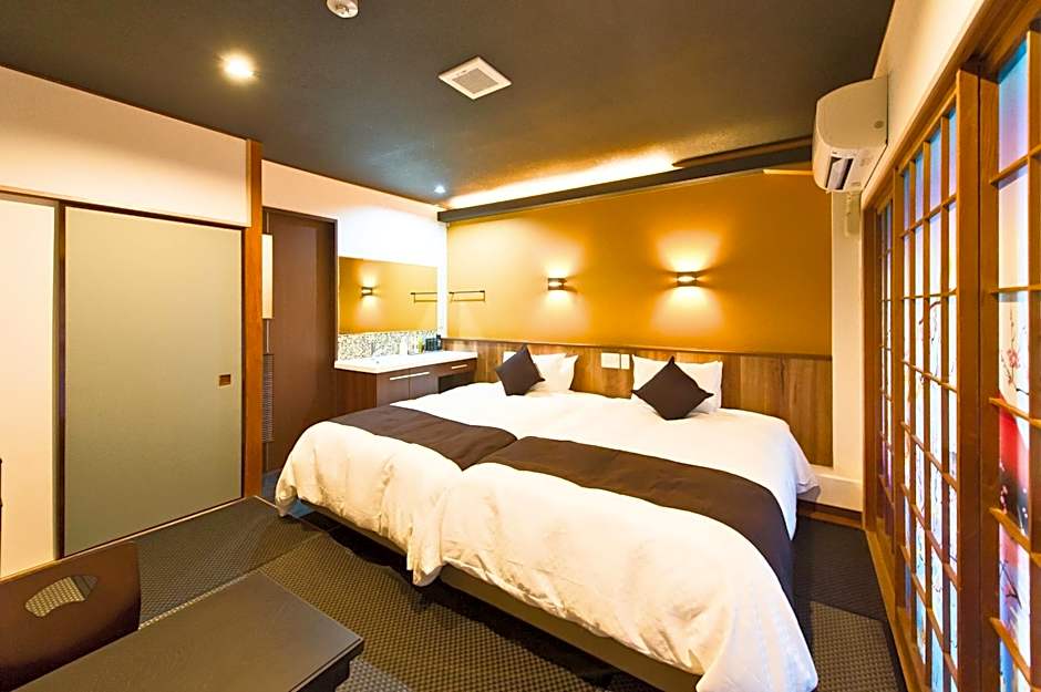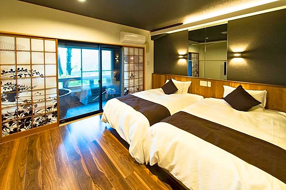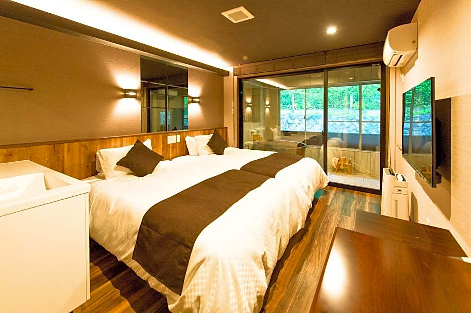 This twin room features a hot tub and a private open-air bath. The spacious twin room features air conditioning, tatami, as well as a private bathroom boasting a bath and a shower. The twin room offers a flat-screen TV, a tea and coffee maker, a dining area, pajamas as well as mountain views. The unit has 2 beds and 3 futons.